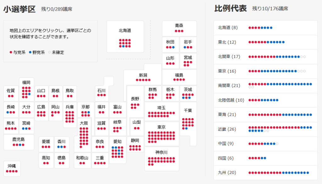 まだ完全な結果ではないが、下の図を見ると小選挙区ではほぼ自民党の勝利…。
