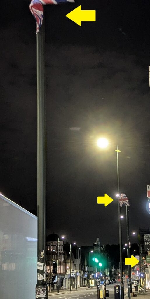 (実際、少し前だが移民反対派(極右)たちがいたるところにユニオンジャックを掲げていた。今も残っているところがあると思う。ちょーっと見えづらいけど、こんな風に。)