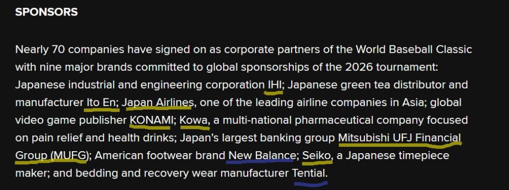 先の記事を改めて読んで、今回のWBCのスポンサーリストを調べてみた。