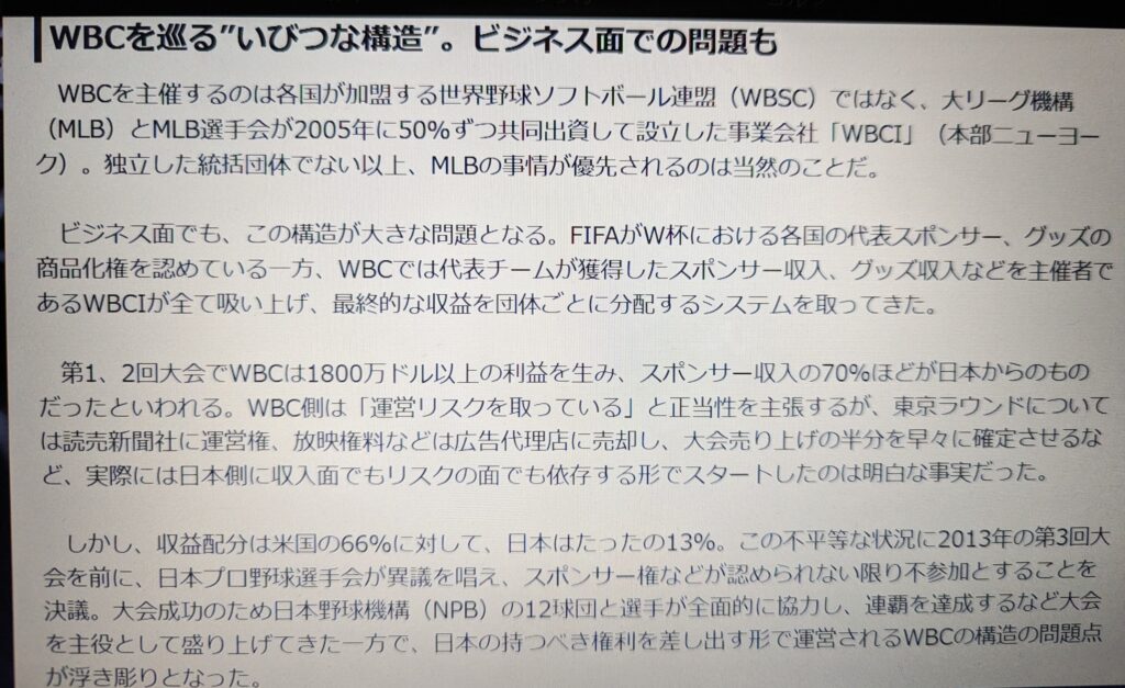 日本企業は今回のWBCを受けて今後のスポンサーをどうするか、しっかり考えてほしいし、日本の国益をしっかり守って、外交もしっかり渡り合える政党にも早く出てきてほしい。